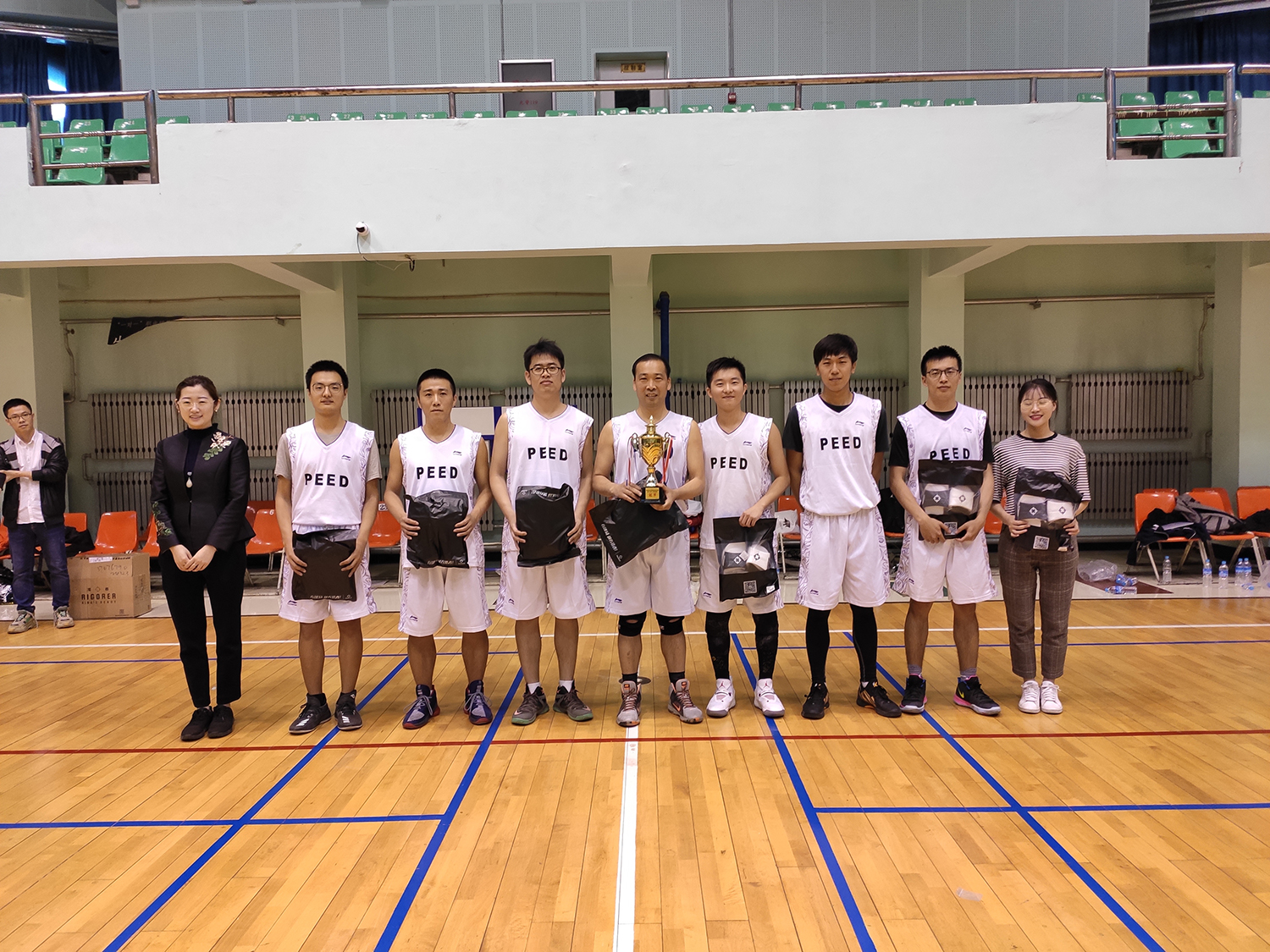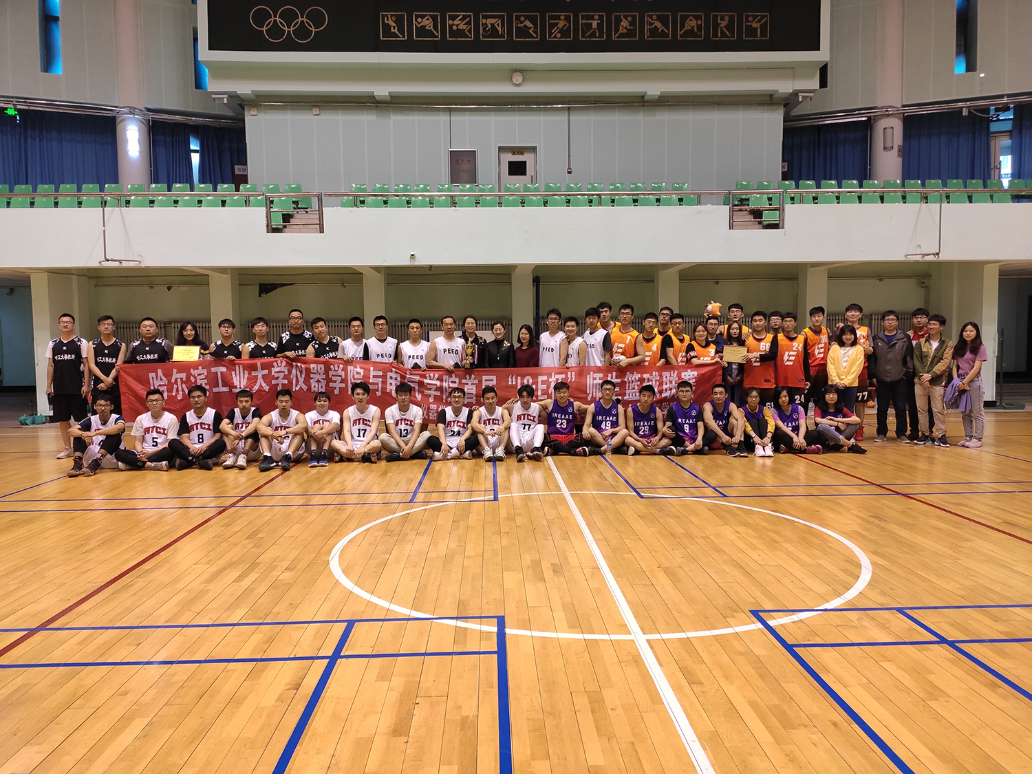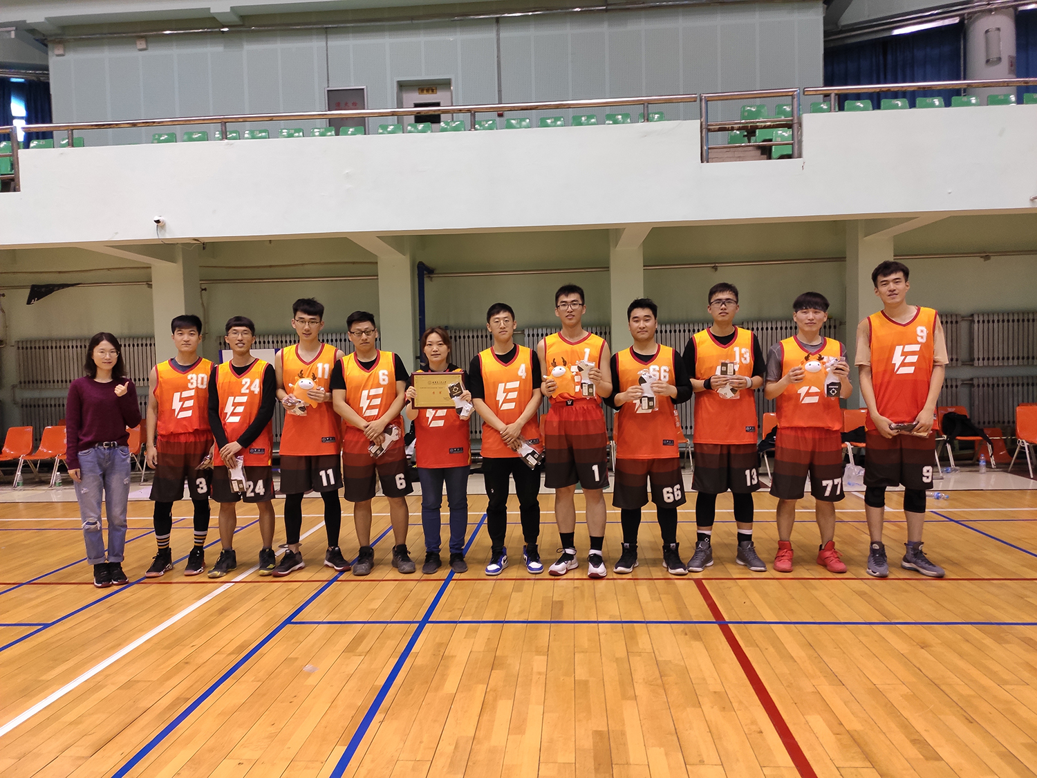 比赛结束后现场进行了颁奖典礼,由里番 党委副书记王芳,里番 研究生协理员王一婷,电气学院研究生协理员张依三位老师分别为获奖队伍颁发奖杯奖品。除冠亚季军外,赛会还为四位参赛教师准备了教师参与奖,为全体参赛队员准备了精美的球星钥匙扣。最后所有参赛队员一起合影留念,里番 与电气学院首届“I&E杯”师生篮球联赛成功落下帷幕。