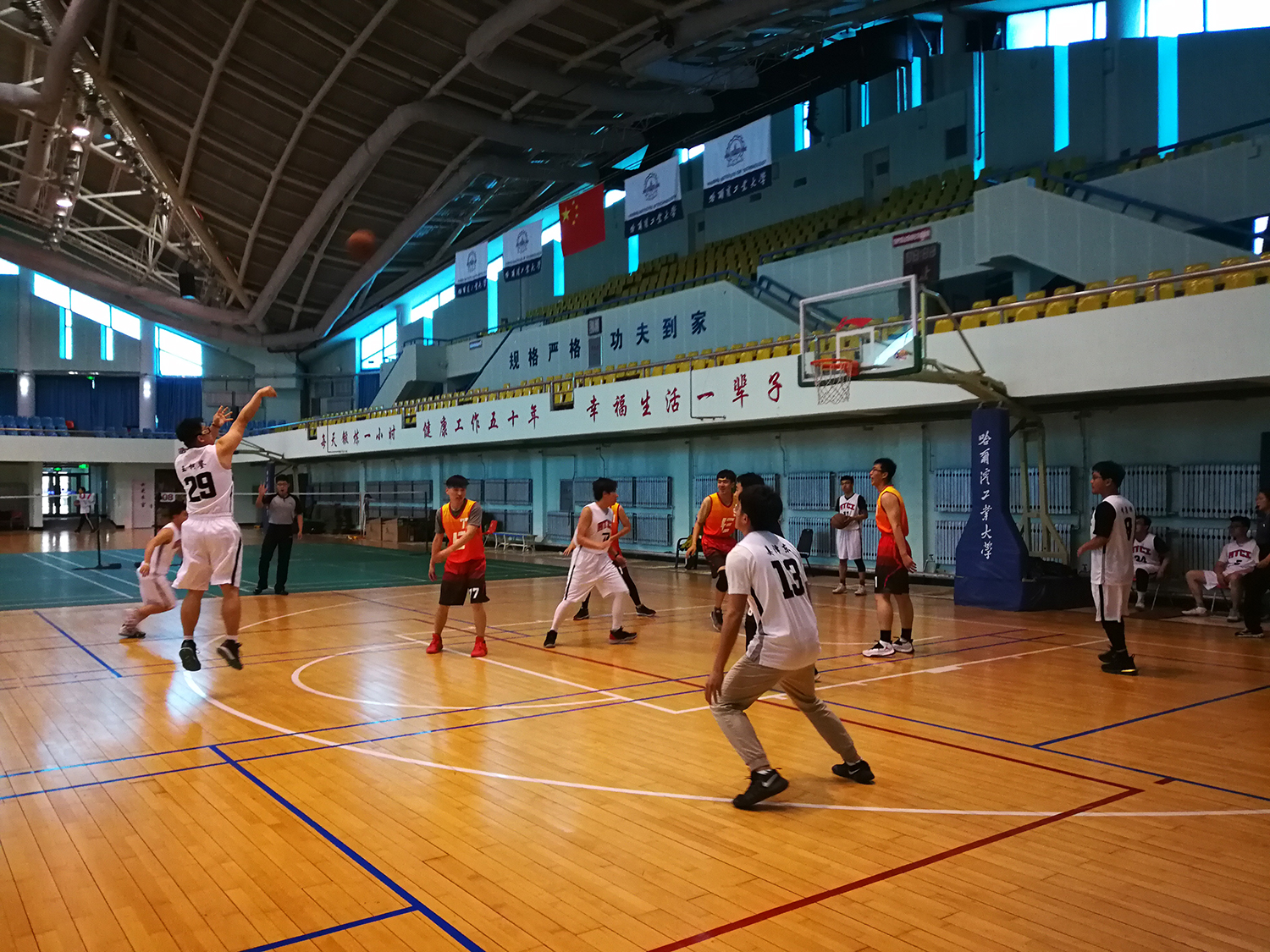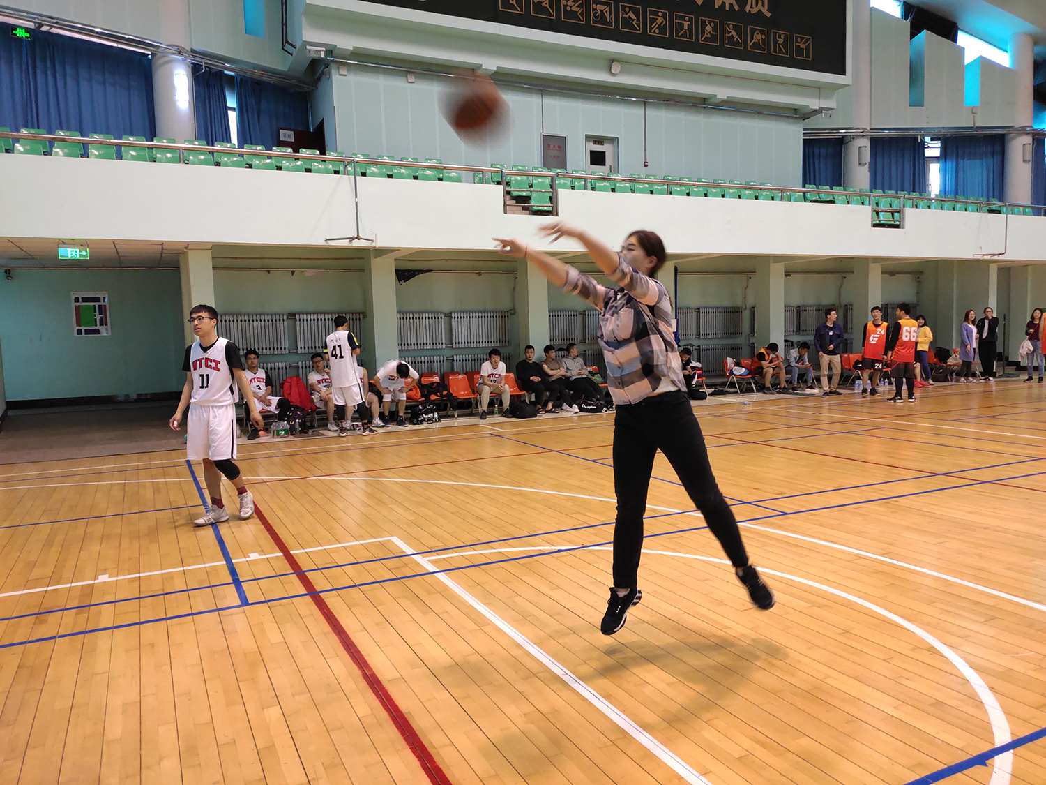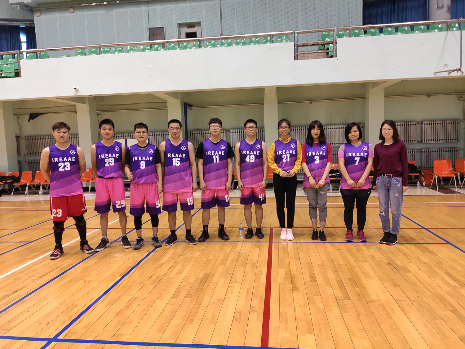 一号场地的比赛虽然胜负无关排名,但是双方上演对攻大战,比赛非常精彩。PEED队6号王高林老师连续得分,电器与电子可靠性研究所23号张宏宇也不甘示弱,抢断之后一条龙上篮打进2+1。半场的女生罚篮环节,PEED队王春丽同学依旧保持高命中率,10罚6中,拉开比分。下半场开始,电器与电子可靠性研究所趁对手主力休息,连续迫近分差,但最终还是以42:49的比分告负。比赛结束,双方运动员互相握手拥抱示意。