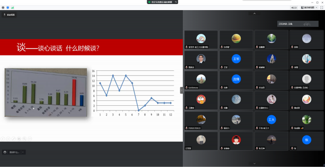 王老师首先介绍了与学生谈心谈话的相关内容以及四六法则。通过谈心谈话可以对学生信息进行细致了解,有助于后续的工作开展,教师应该多留心学生的日常状态,并且注意谈话的方式。王老师建议学生工作者们在第一次谈话时应该像朋友之间的聊天,建立一个基本友好的关系,让学生感受到平等关系以及被尊重,同时他的困扰需要被认真的倾听和共情。王老师还提示道,谈心谈话时要着重关注原生家庭可能对子女的产生一些影响,也是学生工作中比较重要的部分。最后,王老师结合一些实际案例给出了学生压力最大的几个时期以及原因分析,表示应该在相应的时期及时谈心,并从学生的日常表现及特殊需求中多关注学生的情绪变化,了解学生状态。