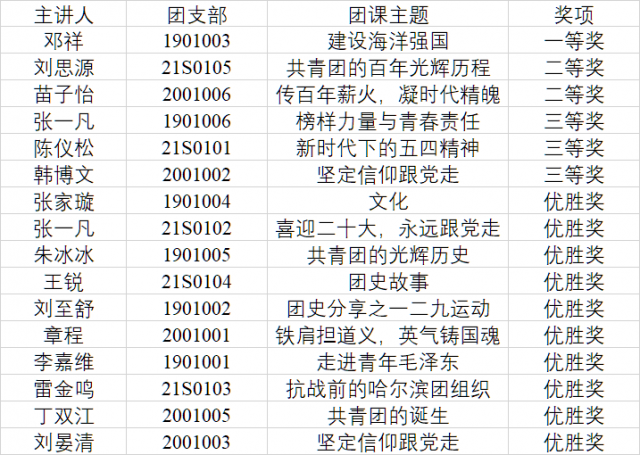 共有来自各个年级的16位选手参加本次比赛,他们紧紧围绕“不忘初心跟党走,青春建功新时代”这一主题,从五四精神、志愿服务、爱国主义等方面挖掘“微”主题,创新授课形式和方法,综合运用PPT、视频、歌曲等丰富多彩的表现形式,将理论知识转化为贴近生活、通俗易懂的小道理,展现了“微团课”的魅力与教育意义。经过激烈的角逐,通过评委公平评审,最终获奖情况如下: