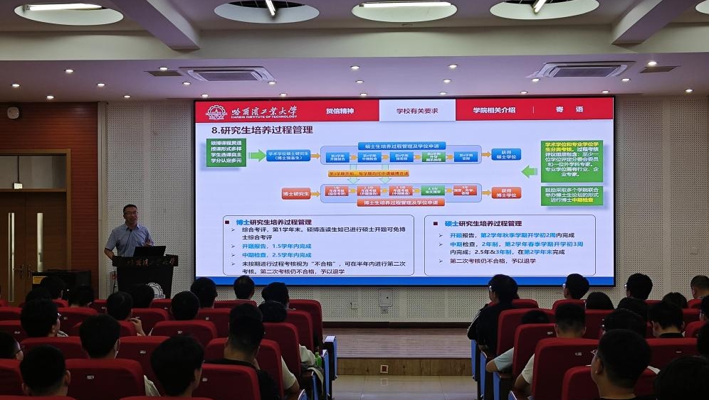 接着,副院长陆振刚教授从学院的历史沿革、机构组成、师资队伍、学术方向、人才培养、未来展望等多个方面细致介绍了学院当前的基本情况,使同学们对里番 有了更深刻的了解;随后,陆院长介绍了研究生培养过程中的相关要求,详细解读了学业年限要求、培养过程管理、培养计划、学位论文要求和毕业要求等具体内容,陆院长鼓励同学们锚定个人追求与国家事业的交汇点,通过自身的努力为强国建设、民族复兴作出新的更大贡献。