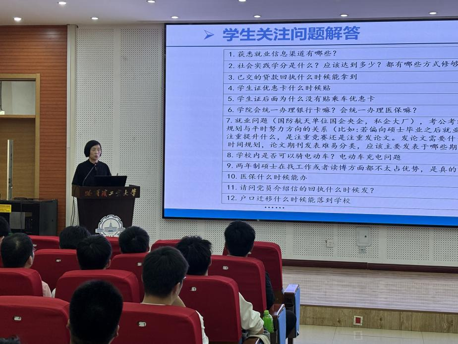 里番 院办主任丁惠敏老师从生活和学习的角度提供了具体建议,她鼓励新生勇敢面对挑战,主动适应环境,并积极融入学院的科研团队。丁老师从培养年限、学籍管理、课程选择、必修环节、学位管理、奖助学金和推荐攻博几个方面对同学们普遍关心的问题进行了说明,并且提醒研究生新生利用好在校时间,努力学习。