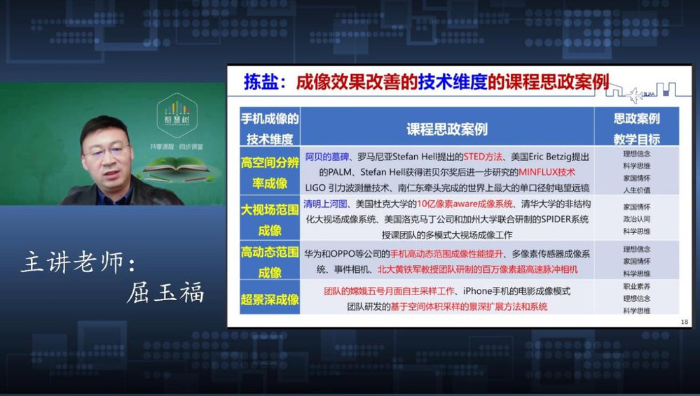 屈玉福教授围绕专业课课程思政建设,以“计算成像技术导论”、“误差理论与数据处理”和“工程光学(下)”课程为例,分享专业课课程思政案例梳理、课程育人理念升华和课程价值塑造融入的“拣盐”、“练盐”和“融盐”三盐步骤课程思政教学设计,以及课程思政教学实践。